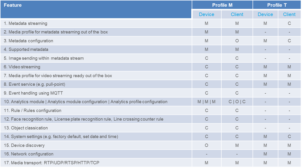 Onvif Profil S spesifikasyonunun detayları için https://www.onvif.org/wp-content/uploads/2017/01/ONVIF_Profile_-S_Specification_v1-1-1.pdf adresini inceleyebilirsiniz.  Hem cihaz hem de client için zorunlu (M) , şartlı (C), opsiyonel (O) olan özellikleri görebilirsiniz.